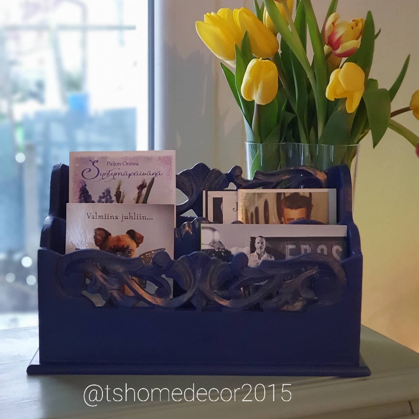 Once you want something new to your home, have a look first at what you have and why you are not happy with it any longer? Is the color wrong? is it too worn, shabby, does it need a bit of a spiced up? I simply want color in our house! Before buying anything new I always look at what I already have and if I can upcycle and reuse them. I have had this letter holder for years, recently it started looking very plain and boring. I had a look which paints I have and which would suit our decor. Dark blue is the winner ![]()