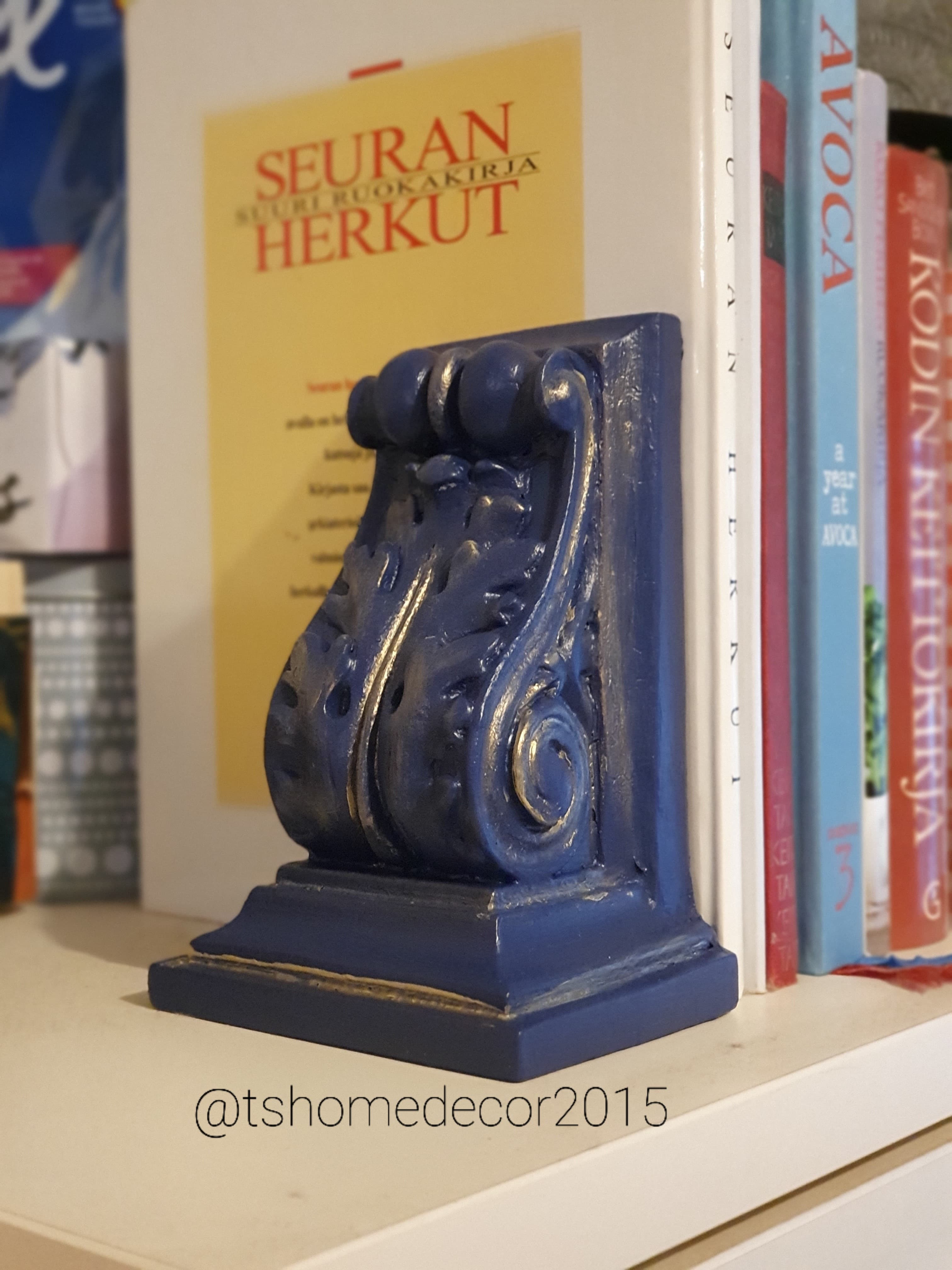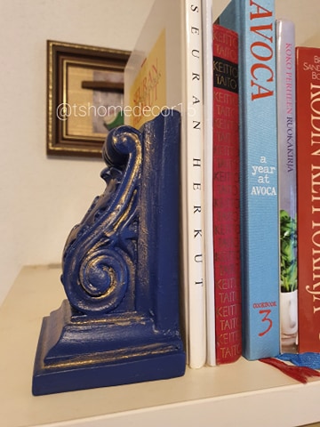 Old bookends got upcycled, by giving them few coat of a dark blue paint and and hint of a gold paint. Easy way to spice up your home colors rather than buying brand new ones.
