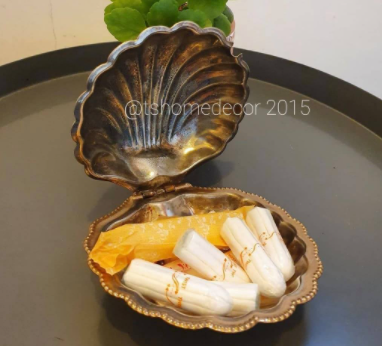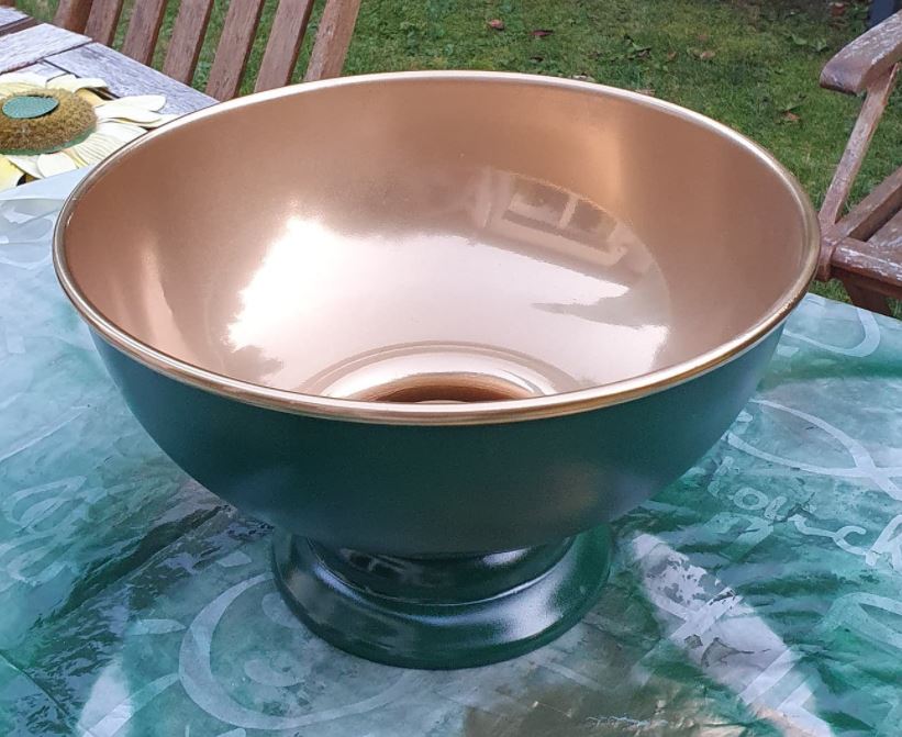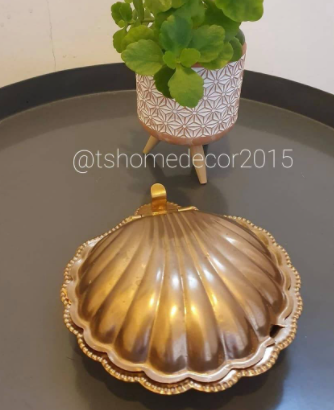 Think outside of the box! I found this beautiful silver color (only color, not real silver) sugar bowl from the local flea market. I fell in love with itΒ΄s shape and instantly knew I needed to have it. I certainly did not need another sugar bowl. I did not know in that moment for what I was going to use it for, but once I got home, I knew! Gave it a good wash, a fresh coat of copper spray paint and it was transformed to a case for lady items.